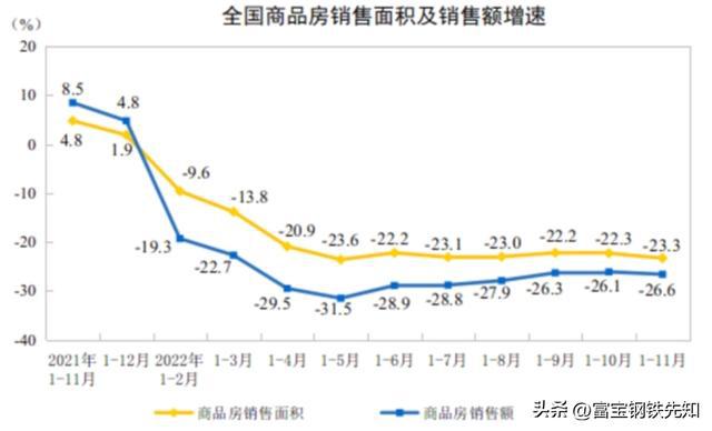 2022年1-11月全國商品房銷售面積及銷售額增速